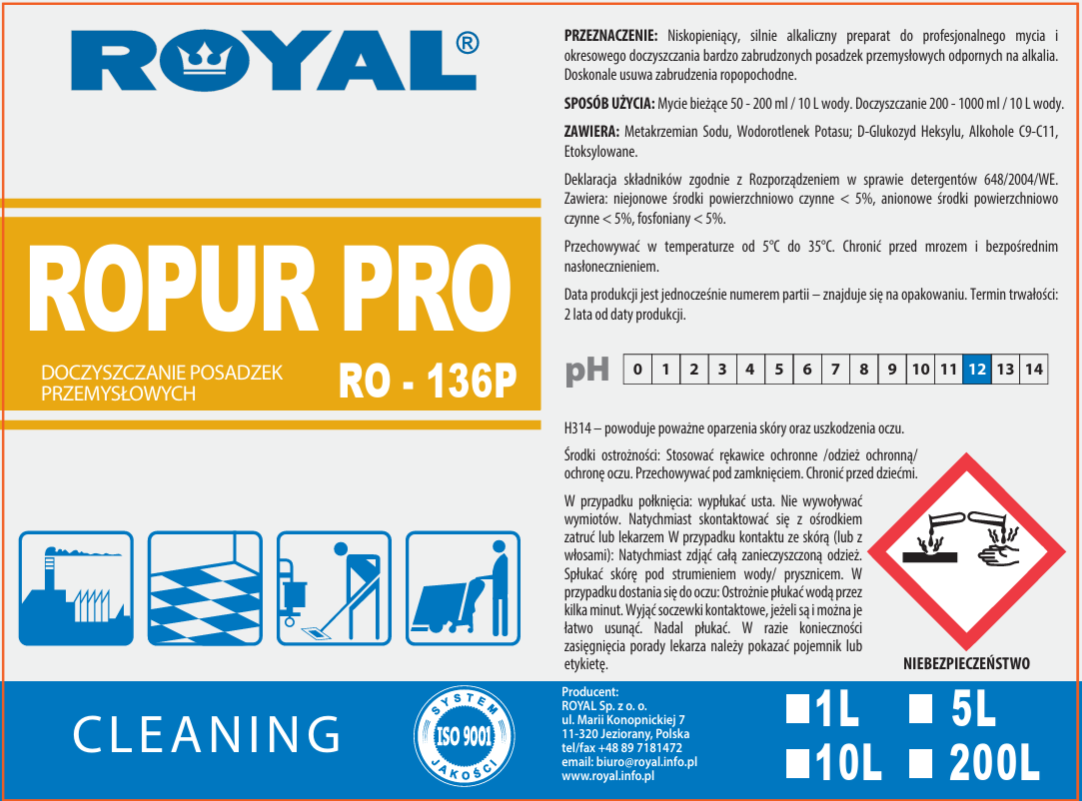 Bardzo mocny środek do profesjonalnego mycia i okresowego doczyszczania bardzo zabrudzonych posadzek przemysłowych odpornych na alkalia. Nisko pieniący, silnie alkaliczny, doskonale usuwa zabrudzenia olejowe i tłuszczowe, nadaje się do czyszczenia podłóg, ścian, hal i warsztatów. Do powierzchni zmywalnych takich jak beton, kamień naturalny i sztuczny, lastriko. Bez dodatku substancji zapachowej, do czyszczenia ręcznego i maszynowego.