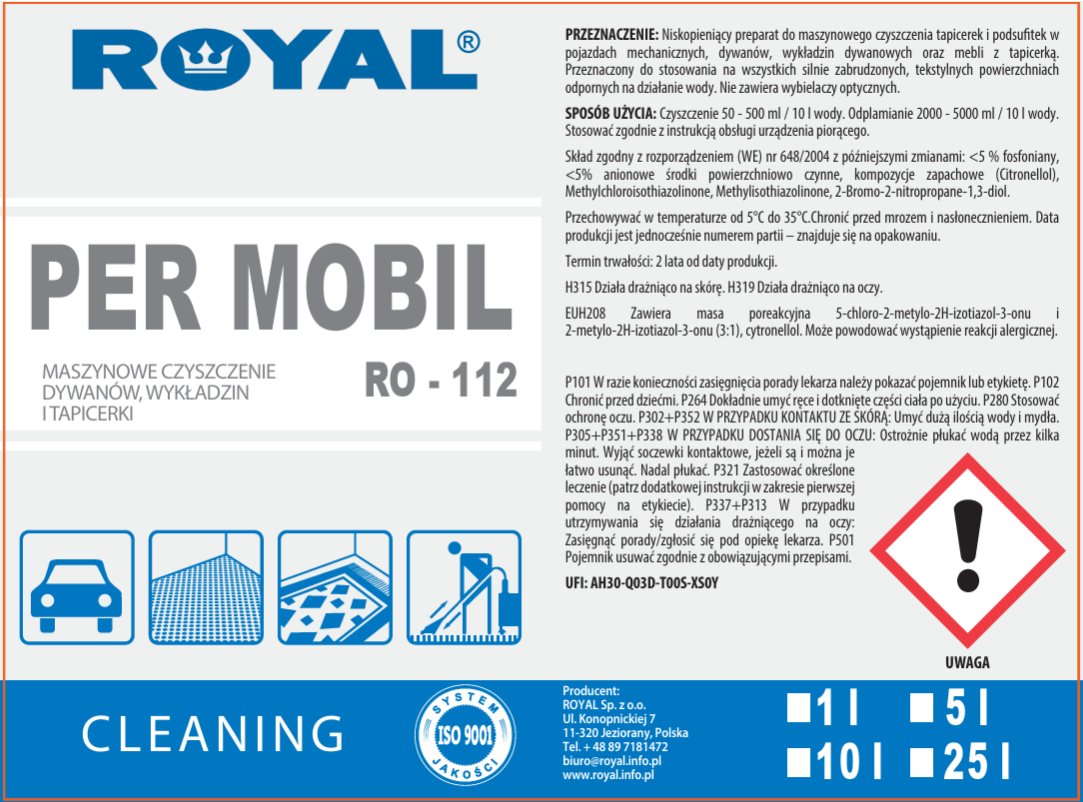 Preparat do maszynowego czyszczenia tapicerek, podsufitek w pojazdach mechanicznych - samochodach, dywanów, wykładzin dywanowych oraz mebli z tapicerką. Do stosowania na wszystkich silnie zabrudzonych tekstylnych powierzchniach odpornych na działanie wody. Nie zawiera wybielaczy optycznych.