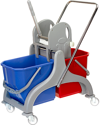 Mocna, stabilna i pewna konstrukcja. Jeden z najbardziej wybieranych wózków do sprzątania. Charakteryzuje się wytrzymałością oraz estetyką wykonania. Wyposażony w prasę do wyciskania mopów. Prasa szczękowa, dokładnie wyżyma włókna mopa. Stelaż wózka, wyciskarka oraz wiaderka wykonane zostały z plastiku ABS - jest to tworzywo odporne na uszkodzenia mechaniczne. Kółka o średnicy 7 cm, pracują cicho i nie niszczą podłóg. Metalowe ramię prowadzące zostało dodatkowo zabezpieczone warstwą chromu. Każde z wiaderek posiada uchwyt do przenoszenia, a ich pojemność wynosi 25 litrów.